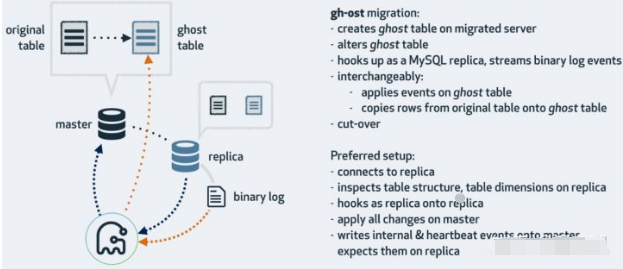 gh-ost是github针对pt-osc用触发器带来的问题而重新设计的一款较新的表结构变更工具。其使用binlog+回放线程来替换掉触发器。示意图如下: