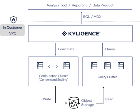 Kyligence 云原生智能多维数据库依托可靠、经济的云对象存储为核心来构建云上数据湖;同时通过云上虚拟机来执行计算分析任务,在计算上进行细致的优化,保证计算资源被最大化利用,实现存储和计算的分离。此外,企业还可以通过 Kyligence 智能识别低效存储并及时清理,保障存储资源被最大化利用。