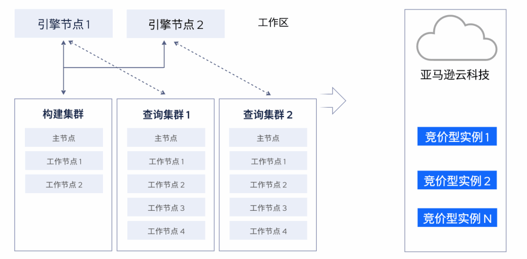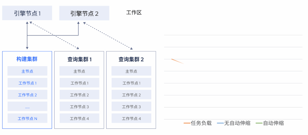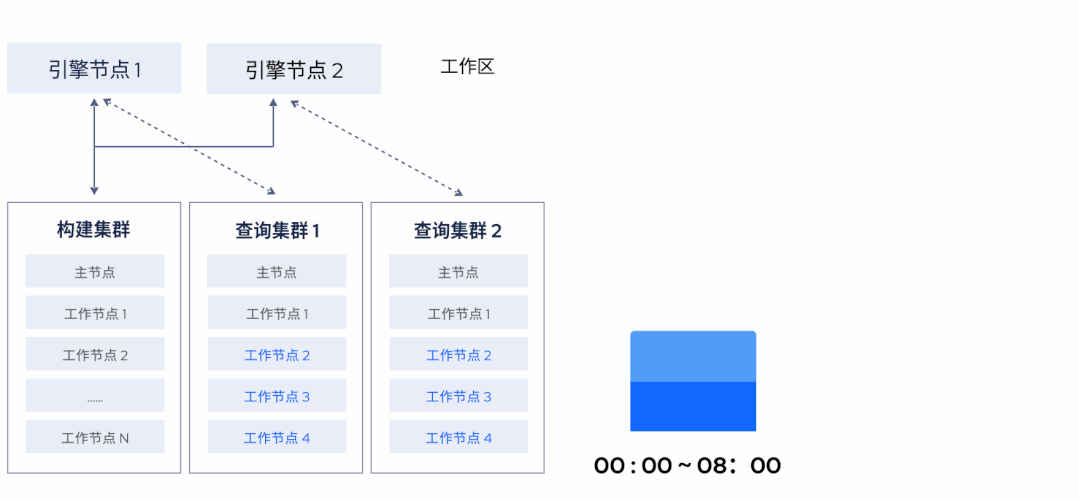 此外该企业发现每天 00:00 ~ 08:00 是查询低峰期,此时段查询集群只需要 2 个工作节点,而其他时间则需要 8 个工作节点,通过设置定时任务来伸缩工作节点数量,可为工作节点节省约 25 % 的云成本。
