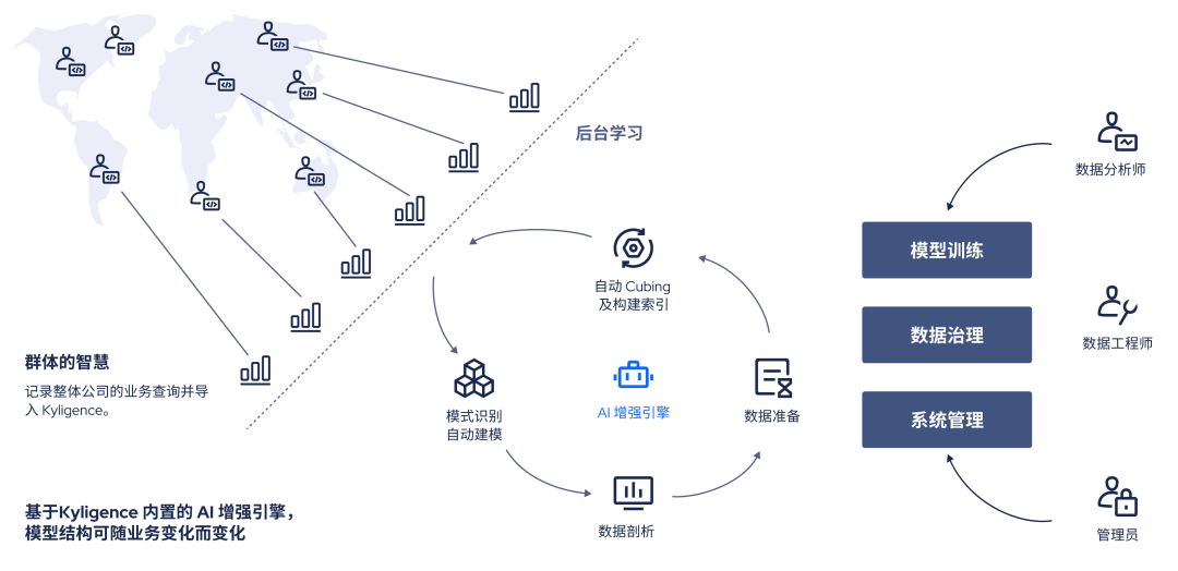 Kyligence 提供内置的 AI 增强引擎,可识别数据特征和查询习惯,利用机器学习算法预测业务分析场景,提供模型设计建议,用户仅需简单地接受优化建议即可快速创建或优化模型,极大降低学习与使用门槛,无需占用技术专家的资源,进一步提升人效。