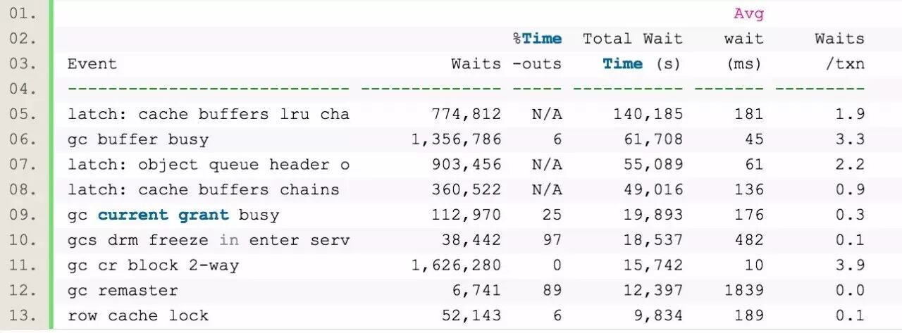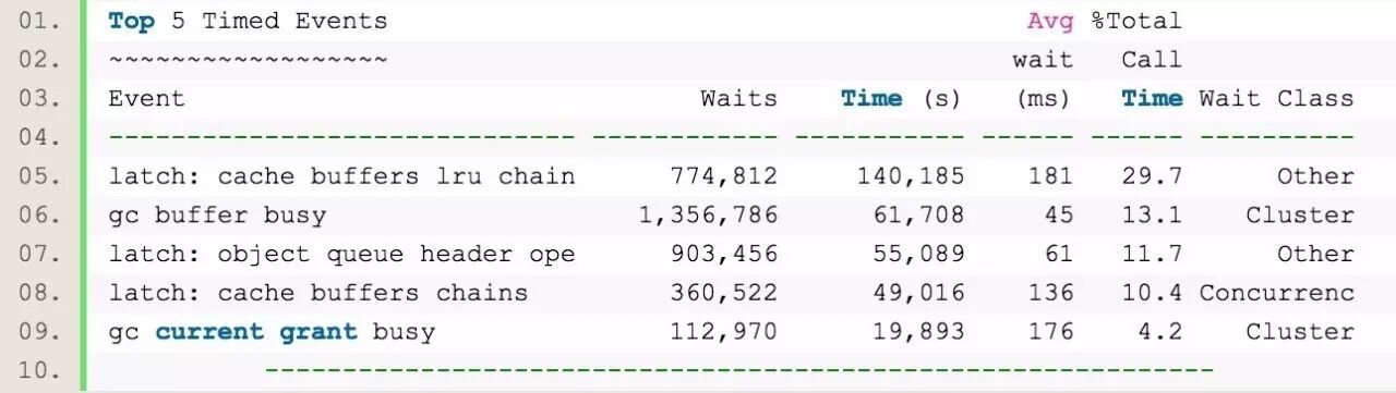 可以看到,TOP 5中,有3个是latch相关的等待,而另外2个则是跟RAC相关的等待。