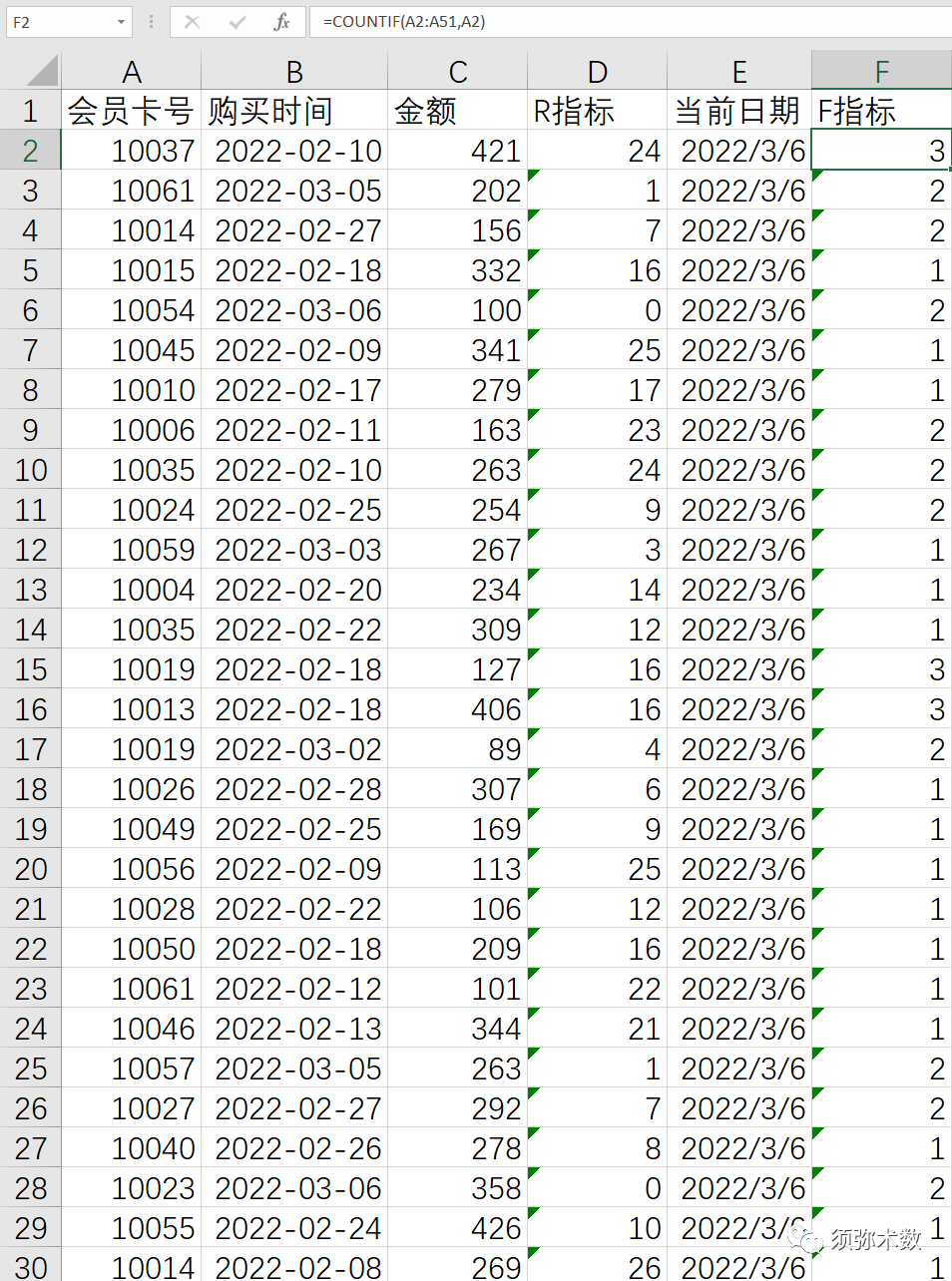 接下来计算F指标,使用conuntif函数(因为数据使用的随机数,所以1次较多。)