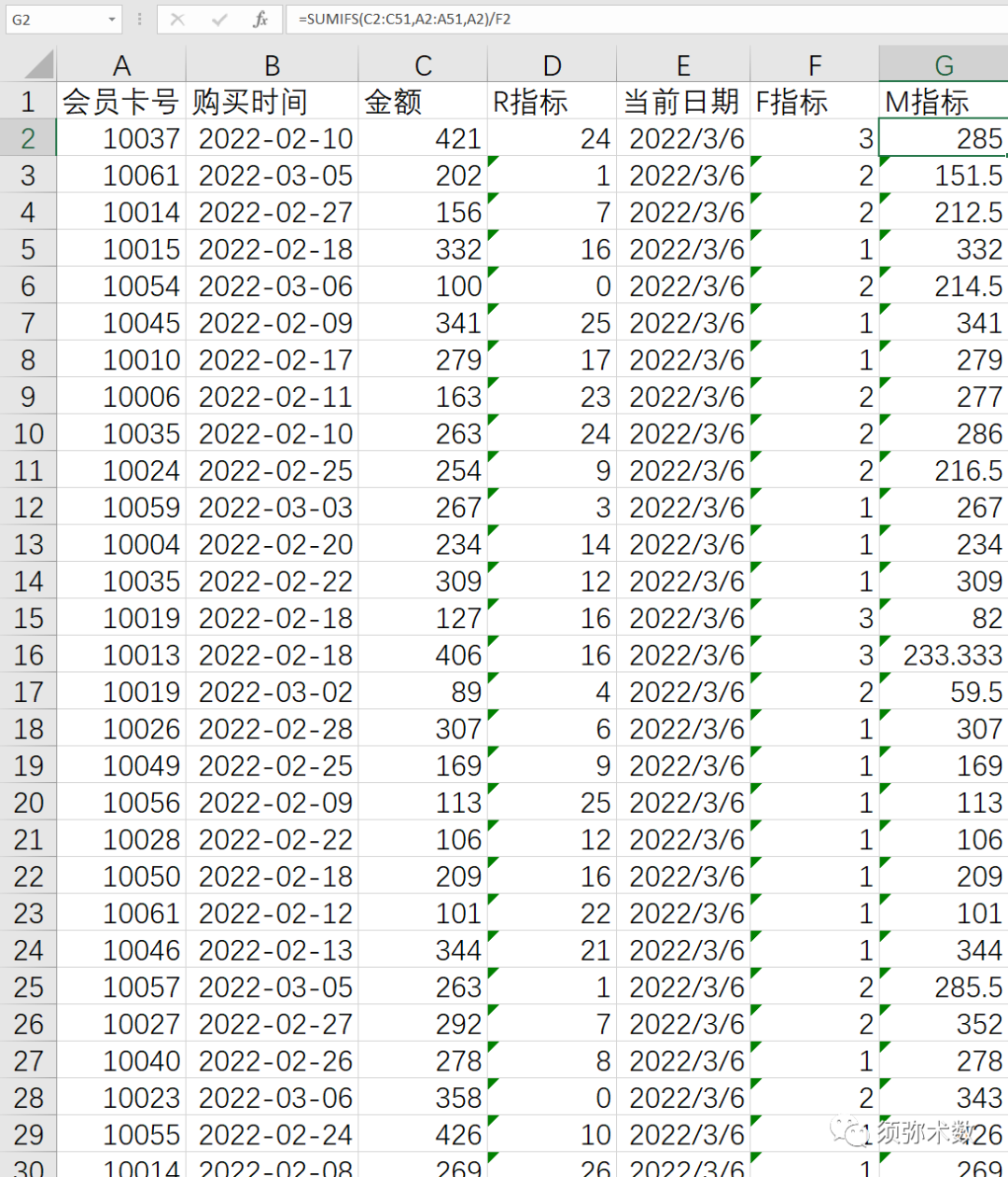 第一步找出R指标,这里用excel来做,用计算日期(这里使用today()函数在R指标后面新建一列当前日期)减去最近一次购买的时间就可以计算出R指标了。如下图