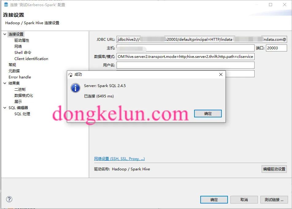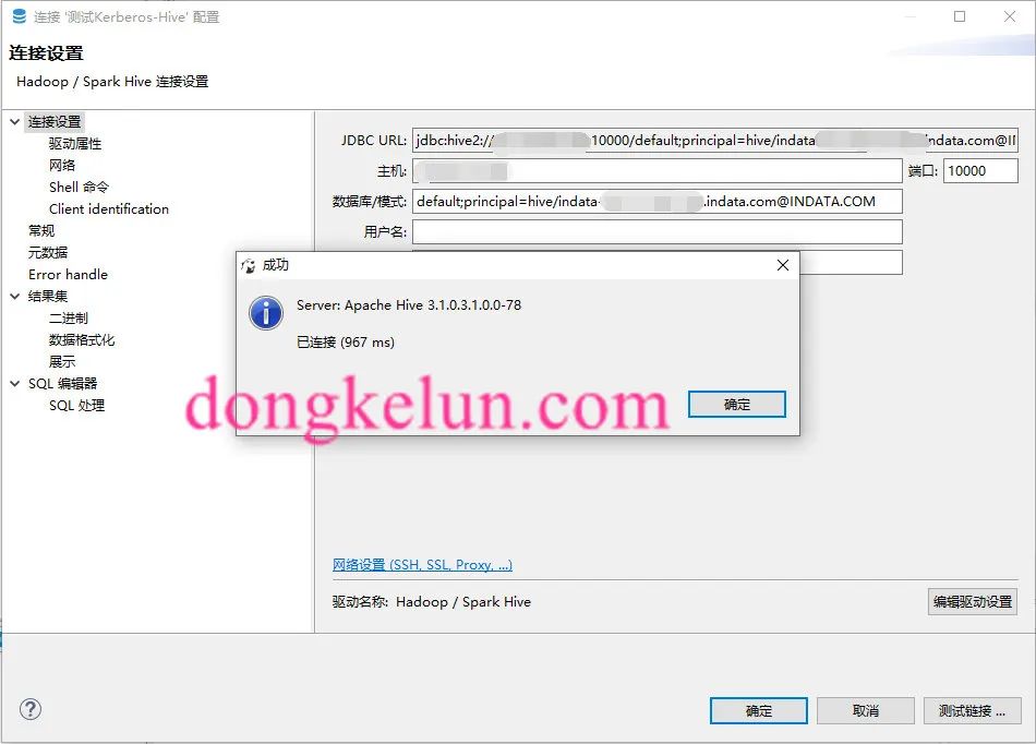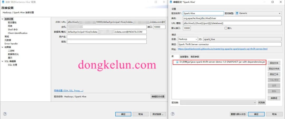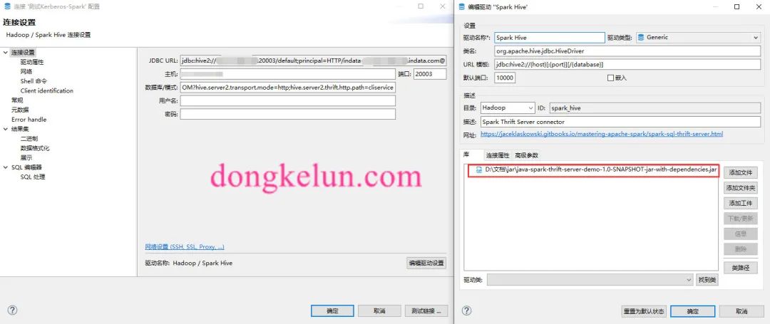 测试连接前先启动hive相关的服务,然后在Dbeaver里:新建->数据库连接->选择Hadoop-Spark Hive->输入主机IP、端口、数据库->然后编辑驱动设置,删除原来的驱动,添加这个项目的jar包https://github.com/dongkelun/java-spark-thrift-server-demo