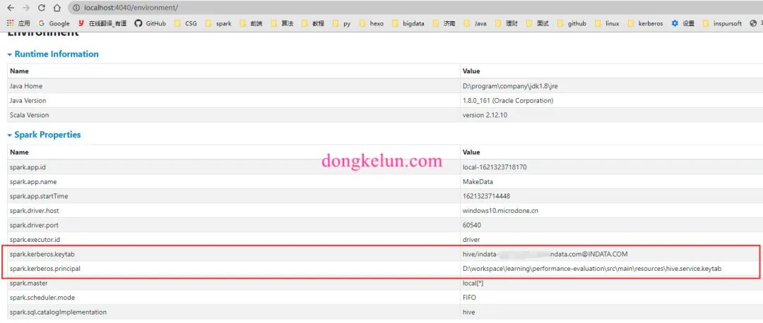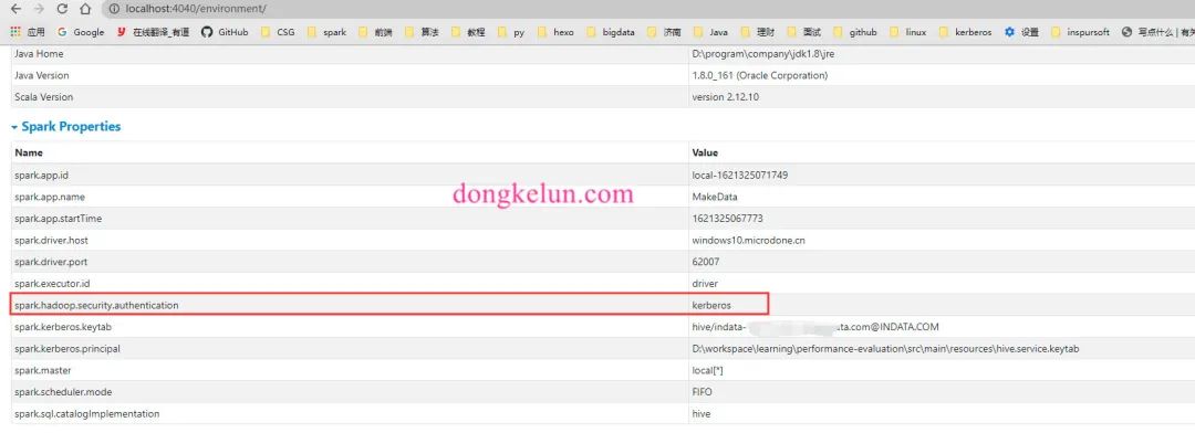 这样从打印的UserGroupInformation.getCurrentUser信息可以发现kerberos认证是成功的,而且代码中设置了hadoop.security.authentication为kerberos,但是依旧报authentication为SIMPLE的异常,网上查资料查了很久都没解决,只能自己进行研究,在本地的Spark UI 界面的environment中查看Spark的环境配置信息发现,虽然在Spark的代码中配置了.config("spark.kerberos.keytab", "hive/indata-192-168-44-128.indata.com@INDATA.COM")、.config("spark.kerberos.principal", "D:\conf\inspur\hive.service.keytab"),且在ui界面中也显示相同的配置,如下图