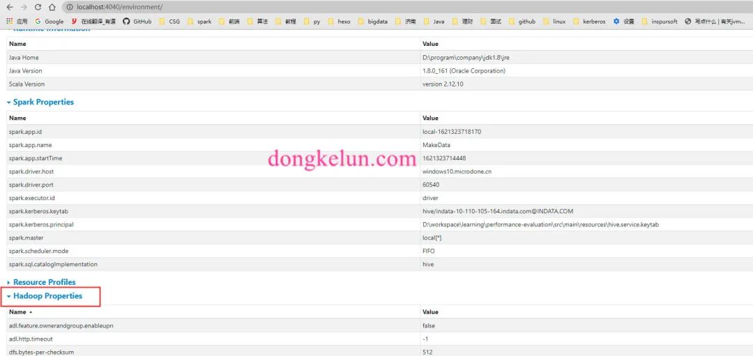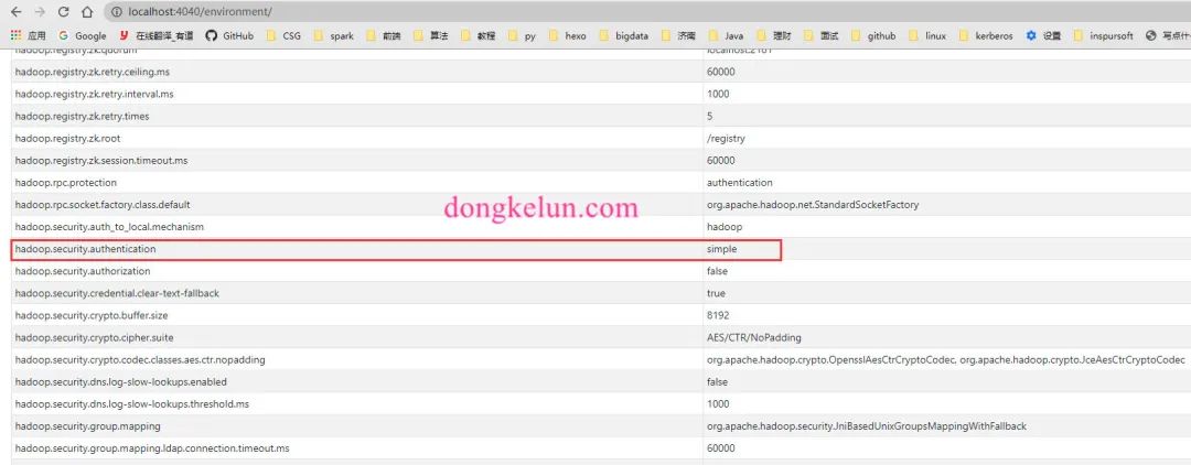 但是依旧报同样的异常信息,后来在界面上发现,除了Spark Properties还有Hadoop Properties,代码中的配置只是改变了Spark Properties,没有改变Hadoop Properties,而Hadoop Properties中的hadoop.security.authentication依旧为simple,这有可能是导致异常的原因。