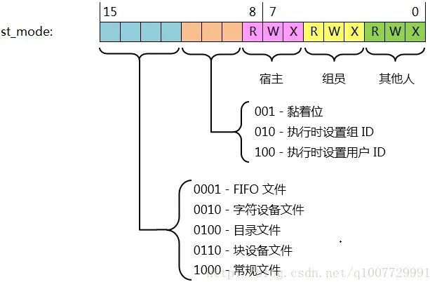 mode字段记录文件或目录权限,以stat命令(st_mode字段)返回的数字编码。0100644表示-rw-r--r--,即/etc/passwd文件的权限为644。