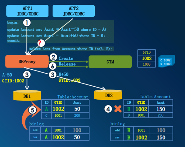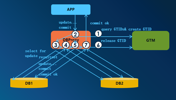 事务开始时申请GTID,事务结束时释放GTID,记录在GTM中的所有事务均为未提交事务,称为活跃事务.创建表时自动增加GTID隐藏列,更新数据时同时更新GTID,采用优化的二阶段提交方式,实现分布式事务处理