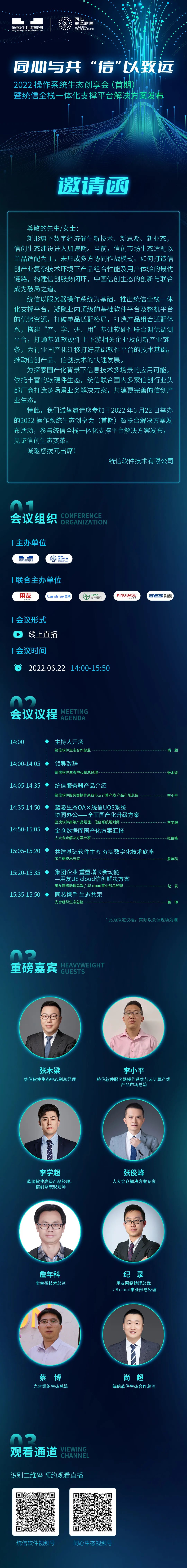 基于此,统信将于6月22日联合人大金仓,以及蓝凌、宝兰德、用友、光合组织等国内多家信创行业头部厂商、组织,召开首期“同心与共 ‘信’以致远2022 操作系统生态创享会暨联合解决方案发布”线上会议,届时,诚邀您线上相聚,共同探索国产化背景下信息技术多场景的应用可能。
