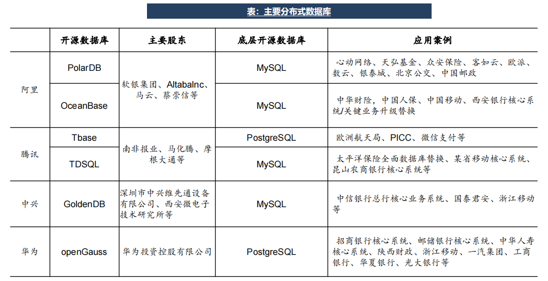 ✓ 分布式数据库技术门槛较高,国内IT巨头引领发展:分布式数据库需要支持非结构化大数据处理,对硬件兼容能力要求高,技术门槛较高。目前国内市场主要由IT巨头引领发展。根据Gartner统计,2020年全球数据库市场市占率排名前35的厂商中仅有阿里、华为、腾讯在榜,均以分布式数据库为主要优势产品,并且分别将旗下数据库OceanBase、openGauss、Tbase等开源,扩大上下游生态影响力并提高产品开发速度和质量,迅速拉开与其余厂商差距,形成寡头竞争格局。