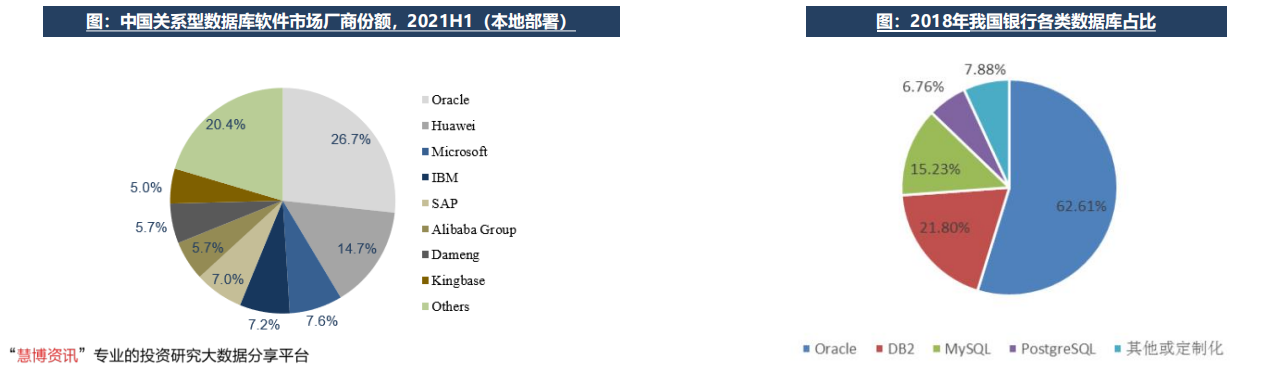 ✓ 截至2021H1,国外厂商仍然占据我国数据库市场份额超过50%,仅Oracle、IBM和微软三家厂商占据市场份额超40%,其中Oracle占据了关系型数据库市场近30%的份额。