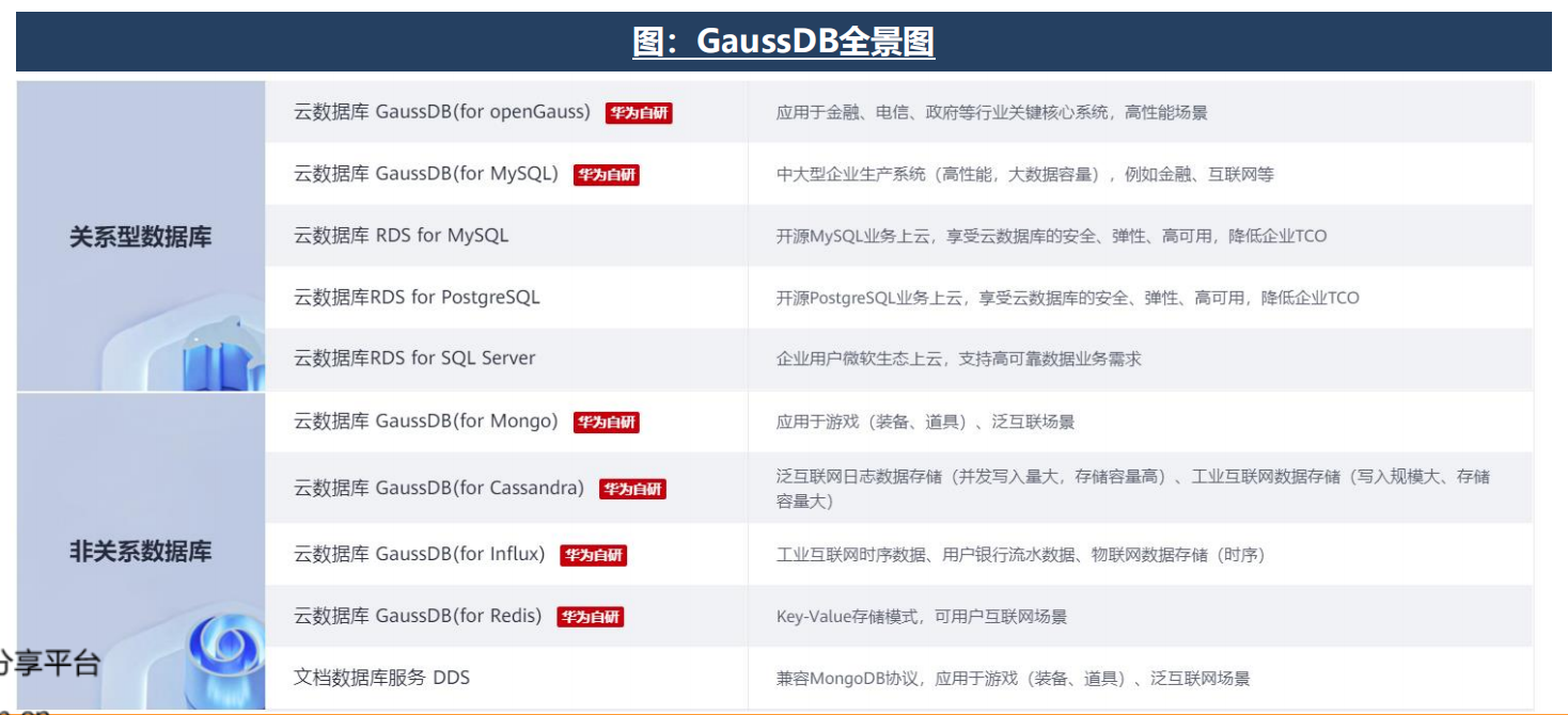 ✓ 华为自研的数据库产品GaussDB T以OLTP和集群为方向,GaussDB A以分析型为主要方向,截止2021年5月底,已为半数以上全国性股份制银行提供超大规模多层并行计算的数据仓库服务。