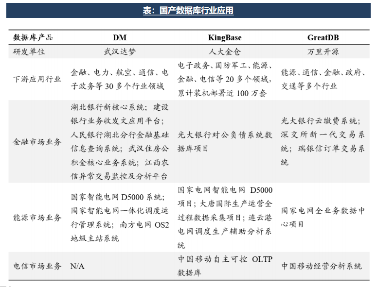 • 人大金仓:成立于1999年,起源于中国人民大学信息学院,是中国电子科技集团有限公司(CETC)旗下具有自主知识产权的国产数据管理软件与服务提供商,底层基于PostgreSQL开发。2021年12月,CETC旗下上市公司太极股份对人大金仓增持股权至51%。2020年人大金仓数据库产品的年度中标金额首次突破5个亿,当年签约超过3.5亿元,在党政关键工程中市占率达到53%。