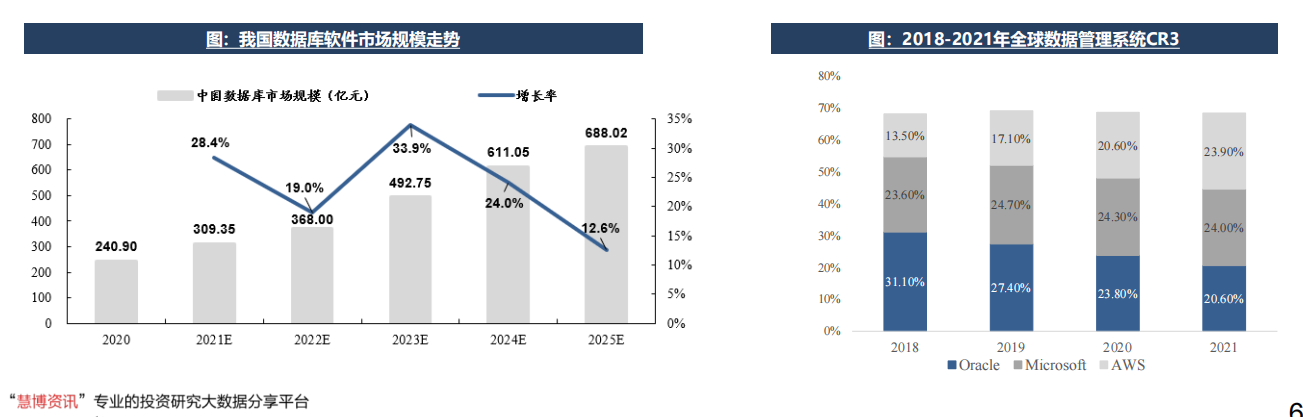 ✓ 全球数据库市场竞争格局较为稳定,2021年CR5超80%。微软、Oracle、Amazon位列前三,市占率均在20%以上。