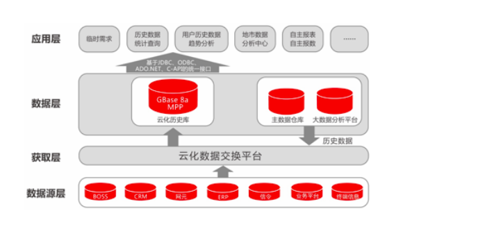 GBASE助力构建GBase平台,集群内部通过万兆网络进行高速连接。改造后历史数据规模扩大到原有5倍;增加互联网类模型和大数据分析平台、主数据仓库生成的DW/ST层数据。具备计费明细数据保存能力增加;具备支持基于历史数据进行数据挖掘和分析、数据长周期趋势分析的计算能力。