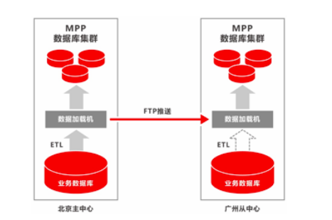 为了实现数据的高安全性,核心系统信息资源规划共享服务平台和DSS决策规划系统采用物理集群在广州,北京两地灾备部署,底层数据来源共享,上层业务协同分工的模式。金关二期将通过建设二地二中心来承载查询分析和OLAP类应用,北京和广州OLAP类数据采用集群灾备模式部署,因此数据如何在两地同步成为金关二期建设中必须要解决的重要技术问题。通过分别部署在北京、广州两个中心的MPP数据库集群数据加载机的FTP推送功能,实现了两个中心MPP数据库集群之间的数据同步,从而保证了北京、广州两个中心的MPP数据库集群的数据一致性。