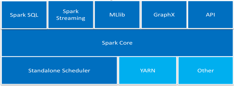 如上图可以看出SparkCore是Spark的核心,Spark部署可以支持StandAlone模式,Yarn模式,Mesos模式,StandAlone模式就是利用Spark自己的资源管理器,Yarn之前说了是一种通用的资源管理框架,官方推荐的是Mesos模式,但是工作中一般是YARN模式,个人理解可能是YARN模式比较通用吧。
