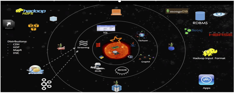 从上图可以看出Spark支持Scala,Java,R、Python语言,每种语言都有相应的库进行支持,但是推荐使用Scala语言,兼容性比较好,因为Spark就是用Scala语言编写的。SparkSQL主要用于批处理作业,实际工作中90%以上工作都是SparkSQL完成的,SparkStreaming子模块主要用于对时效性要求比较高的场景,但其是一种近实时,本质上也是一种批处理,只不过是根据时间分成足够小的批。Spark是一种计算引擎,可以看出其数据源可以来自Flume,Kafka,HDFS,文件等,经过计算后可以存储到Hbase,关系型数据库,HDFS等中,一般流处理都会涉及到Kafka,Spark。