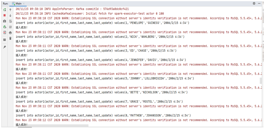 这是控制台日志,可见已经数据已经被spark读取到并插入到mysql中,再验证mysql的actor1表: