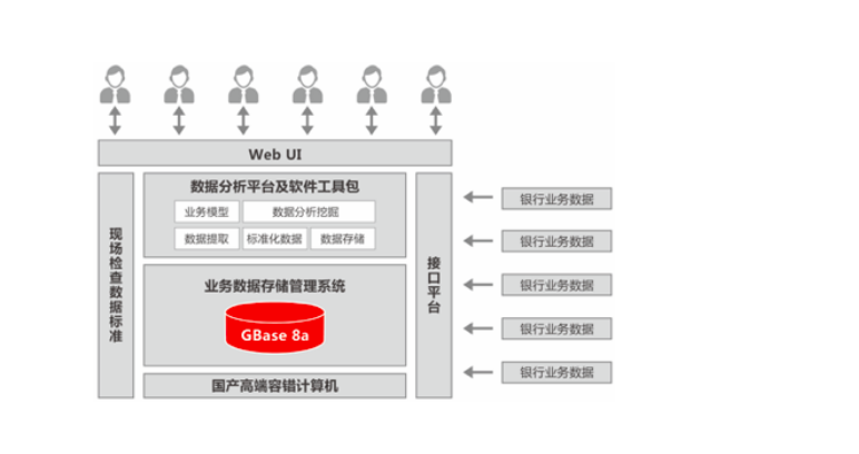 GBase 8a采用列存储和先进压缩算法,对金融数据进行高效压缩存储,同时结合智能索引等技术大大提升系统查询和分析效率,并通过采用基于X86 PC Server大大降低了建设成本。本系统架构如下图所示,以国产高容错计算机为硬件基础平台承载了GBase 8a,业务数据存储管理系统通过接口平台对银行业务数据进行访问、抽取和加载。在GBase 8a的数据支撑下,数据分析平台及软件工具包通过Web UI向用户提供业务模型、数据分析挖掘、数据提取、标准化数据和数据存储等服务。