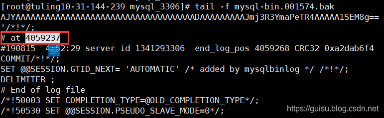 mysql-bin.001574文件最后几行 发现最后偏移量是4059237,从库偏移量的4063315远大主库的偏移量4059237,也就是参数sync_binlog=1000导致的。