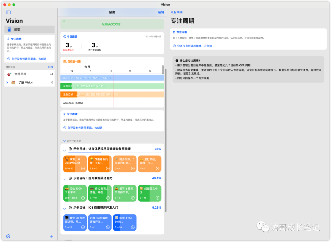 适合管理个人的长期目标,OKR 的形式。使用频率可以是周或者月,当做写总结的地方,