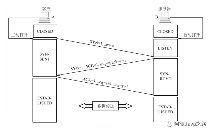 1)第一次握手:客户端向服务端发送一个 SYN 报文(SYN = 1),并指明客户端的初始化序列号 ISN(x),即图中的 seq = x,表示本报文段所发送的数据的第一个字节的序号。此时客户端处于 SYN_Send 状态。