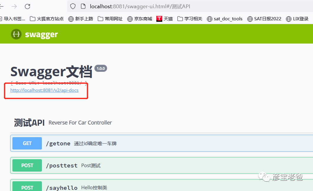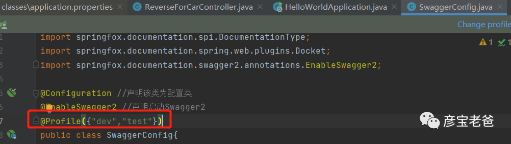 package com.learn.boot.helloworld.config;import org.springframework.context.annotation.Bean;import org.springframework.context.annotation.Configuration;import org.springframework.context.annotation.Profile;import org.springframework.web.servlet.config.annotation.EnableWebMvc;import springfox.documentation.builders.ApiInfoBuilder;import springfox.documentation.builders.RequestHandlerSelectors;import springfox.documentation.service.ApiInfo;import springfox.documentation.spi.DocumentationType;import springfox.documentation.spring.web.plugins.Docket;import springfox.documentation.swagger2.annotations.EnableSwagger2;@Configuration //声明该类为配置类@EnableSwagger2 //声明启动Swagger2@Profile({"dev","test"})public class SwaggerConfig{@Beanpublic Docket customDocket() {return new Docket(DocumentationType.SWAGGER_2).apiInfo(apiInfo()).select().apis(RequestHandlerSelectors.basePackage("com.learn.boot.helloworld.controller"))//扫描的包路径.build();}private ApiInfo apiInfo() {return new ApiInfoBuilder().title("Swagger文档")//文档说明.version("1.0.0")//文档版本说明.build();}}加入API注解