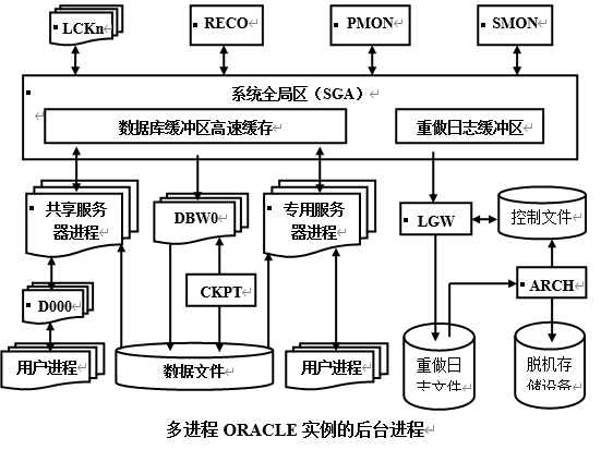 6 | 存档(ARCH) | 功能:联机重做日志填满时,将日志内容拷贝到指定的存储设备中。 说明:在ARCHIVELOG方式中重做日志和自动存档使能时,ARCH才出现。 |
