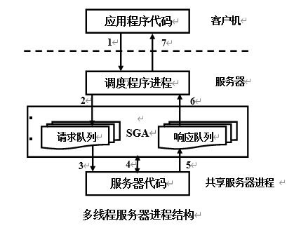 多个用户进程可共享一个可用的服务器进程池(不同于共享一个服务器进程),用户进程直接与调度进程连接,调度进程通过请求和响应队列与下一个可用的服务器进程连接。该配置降低系统开销,增加用户个数