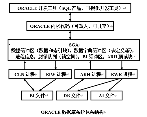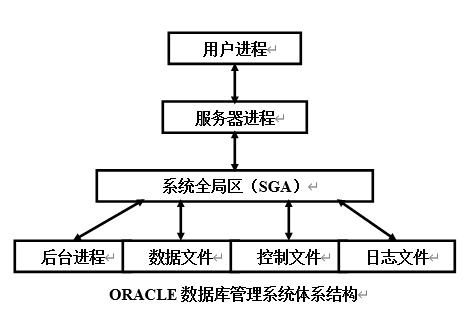 数据库实例:存取和控制数据库的软件机制,SGA(System Global Area)和ORACLE进程的组合,内存和进程用于管理数据库的数据,并为数据库用户服务。
