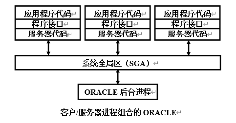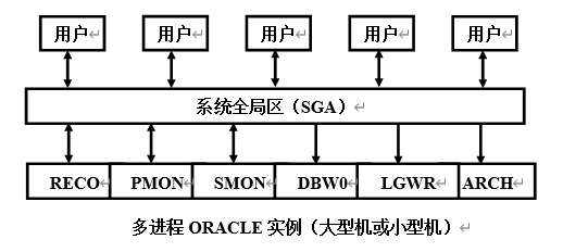 多个进程负责执行代码的不同部分,为每个连接的用户使用单独的进程,又称多用户ORACLE。用户进程执行客户端代码(应用程序或ORACLE工具代码),ORACLE进程执行ORACLE服务器代码。