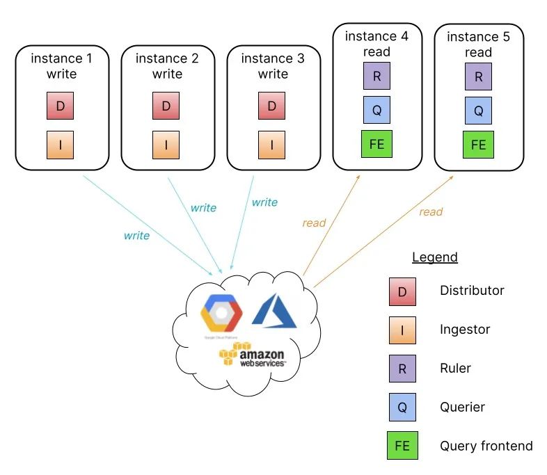 这种读写分离的模式需要在 Loki 前面有一个负载均衡器,它将 /loki/api/v1/push