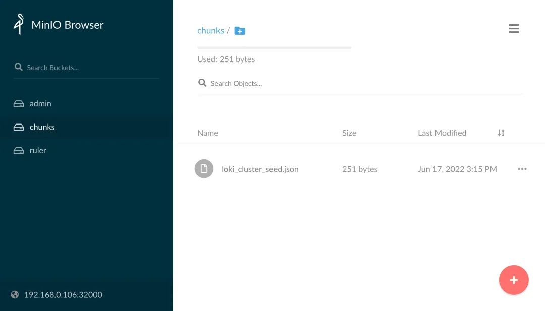 的请求,也就是 promtail 发送过来的,正常来说现在日志数据已经分发给 write 节点了,write 节点将数据存储在了 minio 中,可以去查看下 minio 中已经有日志数据了,前面安装的时候为 minio 服务指定了一个 32000 的 NodePort 端口: