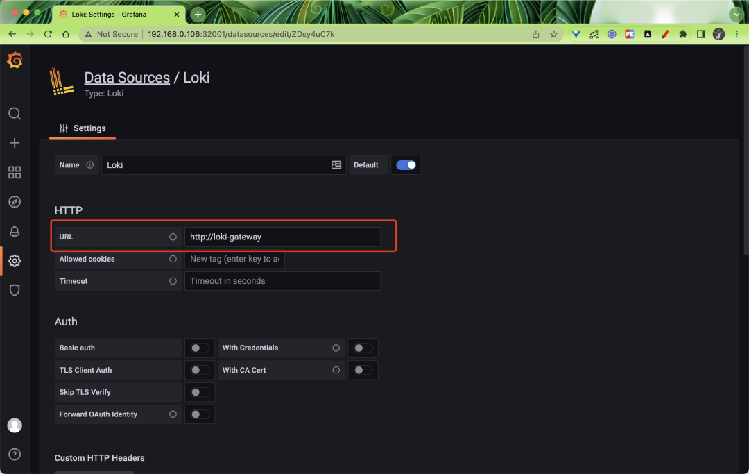 登录后进入 Grafana 添加一个数据源,这里需要注意要填写 gateway 的地址 http://loki-gateway