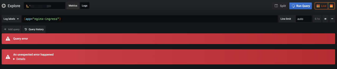 grafana 中开启实时日志时提示 Query error