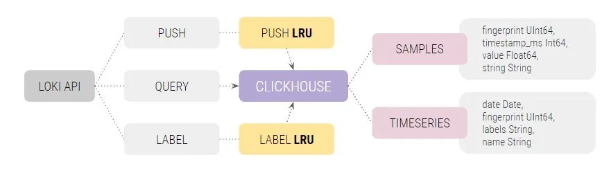 cLoki 实现了一个完整的 LogQL API,该 API 由位于 ClickHouse 表之上的快速批量 LUR 缓存,并依靠其列式搜索和插入性能以及存储数据的可靠分布和集群功能。就像 Loki 一样,cLoki 不会解析或索引传入的日志,而是使用与 Prometheus 相同的标签系统对日志流进行分组。