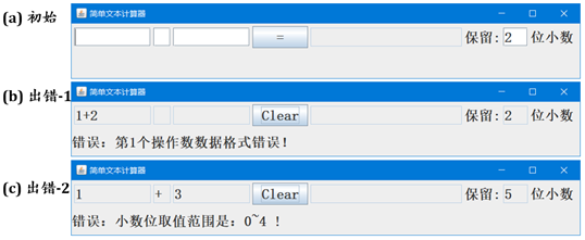 本例定义了三个异常类,当操作数/符文本框为空时抛出NoneException异常,当运算符多余一个字符或是不包含+-*/时抛出OpCharException异常,在小数位整数超出[0-4]范围时抛出DotNumberException异常。将文本框中的字符串转换成double/int时可能发生数据格式异常NumberFormatException,在捕获后重新创建(以便填入中文信息)并抛出,类似处理的还有ArithmeticException(除零异常)。上述异常的创建和外抛放置在getDouble(…)、getInt(…)、getChar(…)、compute(…)等方法中。