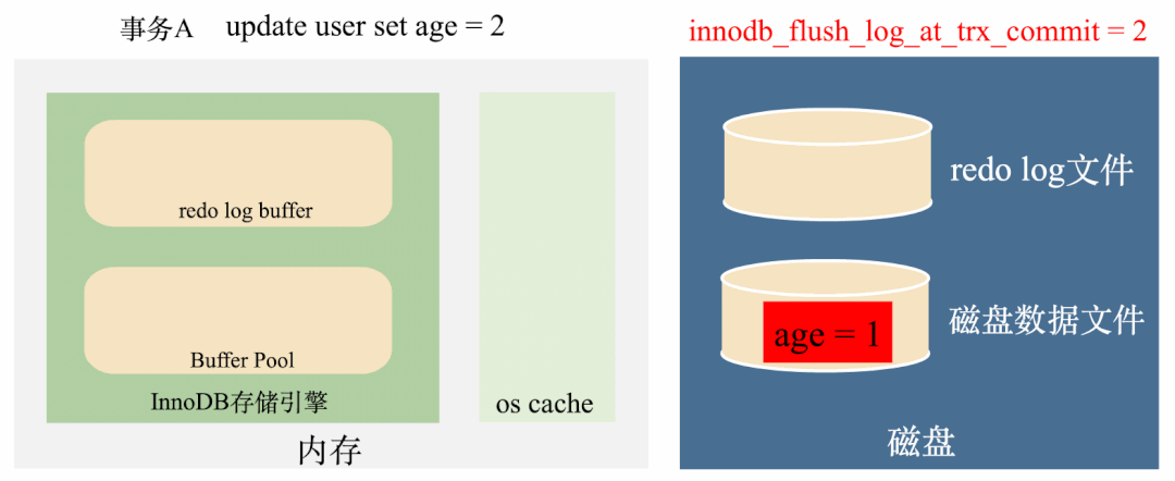 这种策略在事务提交之前会把redo log写到os cache中,但并不会实时地将redo log刷到磁盘,而是会每秒执行一次刷新磁盘操作。
