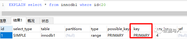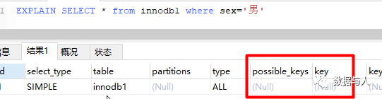 -- 增加一个没有建立索引的字段alter table innodb1 add sex char(1);-- 按sex检索时可选的索引为nullEXPLAIN SELECT * from innodb1 where sex='男'