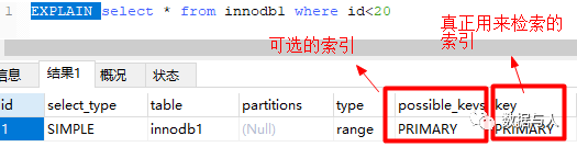 上图中,根据id查询记录,因为id字段仅建立了主键索引,因此SQL执行可选的索引只有主键索引,如果有多个,最终会选一个较优的作为检索的依据。