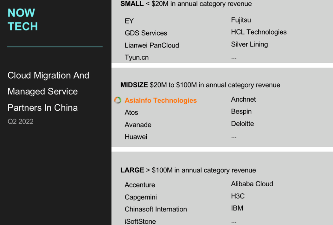 近日,国际著名ICT研究与咨询机构Forrester发布了《Now Tech:中国云平台和托管服务主流供应商矩阵》,亚信科技凭借完备的IT平台产品体系——PaaS、DevOps及云管平台CloudOS等入选该矩阵,同时入选的还有埃森哲、阿里云、IBM、华为、德勤等厂商。亚信科技技术中台体系已逐步迈入云平台和托管服务市场领先行列。