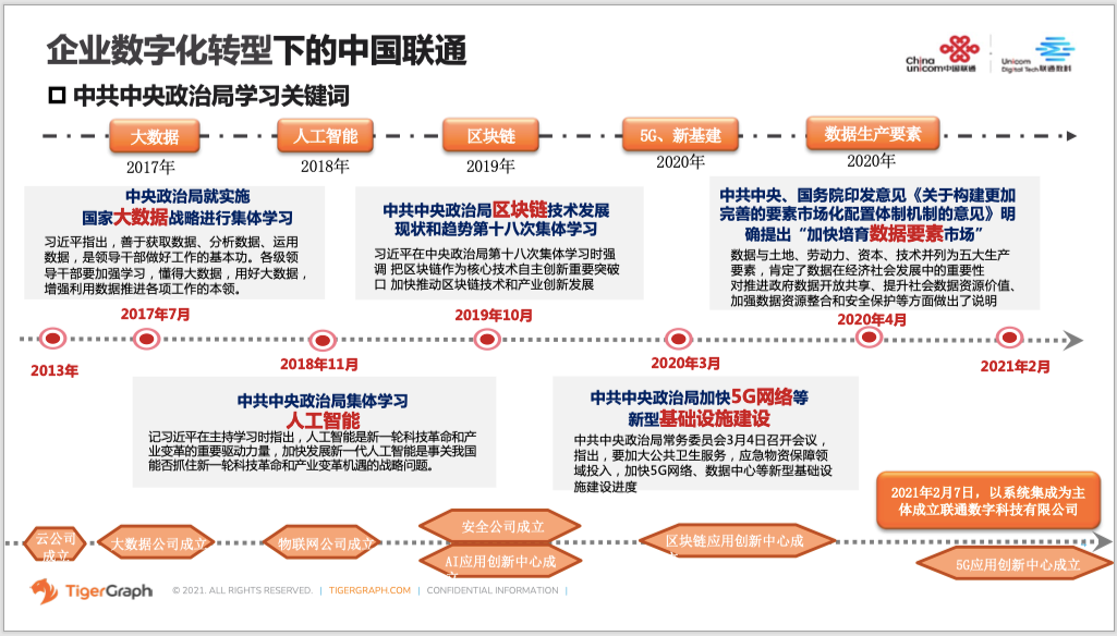 那么在国家政策的实施下,我们公司也是做出了积极的响应。我们首先来看第一条时间线,是近年来国家下达的政策中有关数字化的重点词。第二条时间线,则是联通针对近年来国家颁布的法律法规和指导意见所作出的实际行动。具体来看: