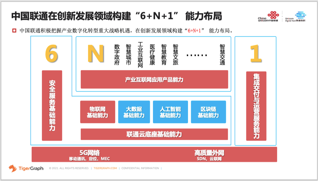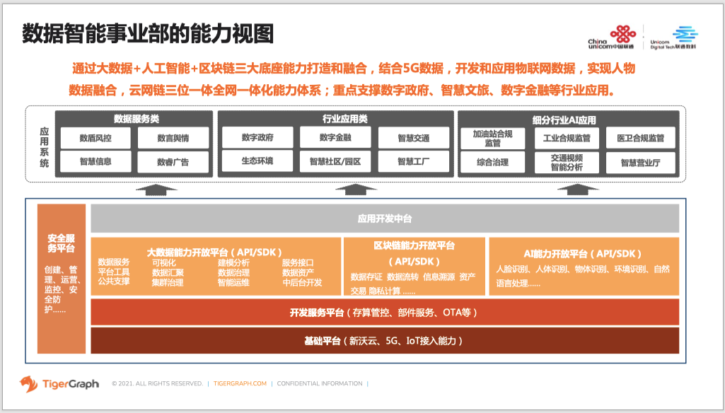 同时,我们中国联通也承担了政企BG 6+N+1创新业务能力体系中大数据、人工智能、区块链的能力建设。通过大数据+人工智能+区块链三大能力底座的打造和融合,结合了5G数据、开发和应用物联网数据,实现人物数据融合,云网链三位一体化能力体系,重点支撑数字政府、智慧文旅、数字金融等行业应用。