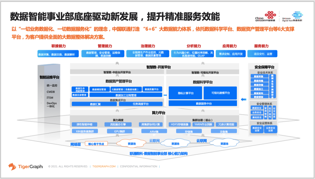 下面也是我们中国联通在实际技术能力上的一些具体体现,主要从打造6+6大数据能力体系、依托数据科学平台、数据资产管理平台等六大平台支撑,为客户提供全面的大数据整体解决方案。