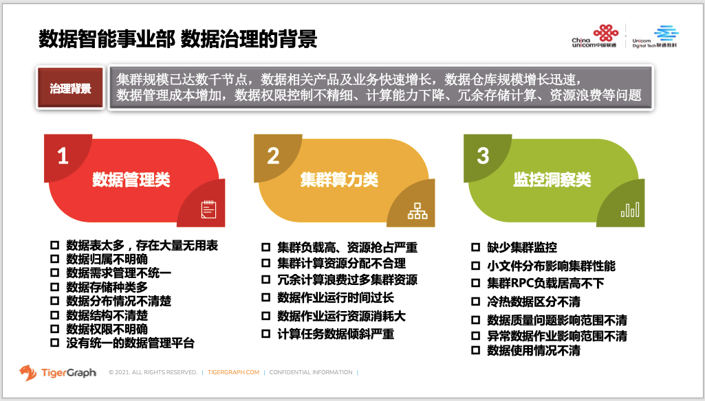 联通数科数据智能事业部,在2018年集群规模就达到了数千节点,同时数据相关资产及业务迅速增长,数据仓库规模也在快速膨胀。而我们因为数据管理成本的增加,计算能力的下降,冗余存储、冗余计算等资源浪费的一系列问题,让我们数据环境一度处于失控状态,需要投入大量人力资源去保障数据环境的运行。