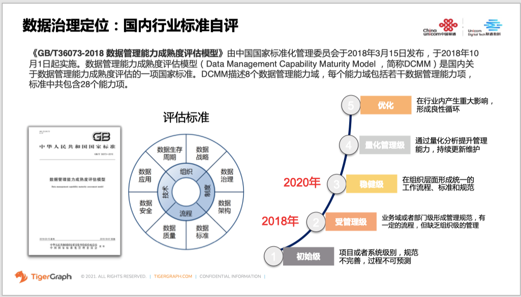 那说到数据治理这块,国外已有了像DAMA、CMMI、DCMM这样相对成熟的理论体系,里面包括很多的能力域、过程域、价值域的建设。在这里面,联通数科主要参考对标的是国家的DCMM标准,即数据管理能力成熟度评估模型。这是一套综合标准规范、管理方法论、模型评估等多方面内容的综合框架。模型覆盖8个数据管理能力域,28个数据管理能力项,5个成熟度等级。我们已经完成了DCMM成熟度的等级评估,达到了四级的标准。