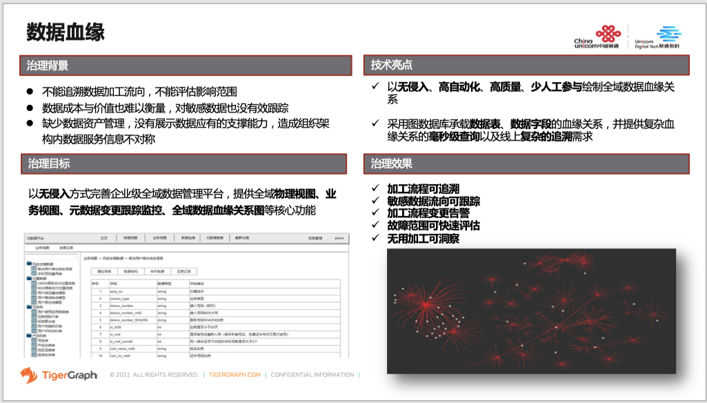 各位专家,各位朋友大家好。我是联通数字科技有限公司的冯翰斌。首先特别感谢TigerGraph提供这样的机会,能够让做图应用的行业、企业共同分享和探索各自领域内图相关知识的探索与实践。在数字化转型的背景下,中国联通大数据业务也是得益于全国数据物理大集中的优势,率先探索市场化对外服务,也积累了一定的市场化要素配置的经验。因此,今天的内容也是基于公司的一些技术能力的实践为大家分享,主题是基于图的数据治理加速企业数字化转型。