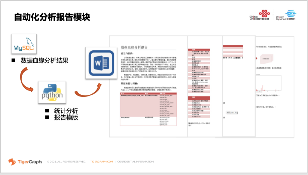 以上血缘分析的结果就可以应用于自动化分析报告模块。以Python实现的模块,从MySQL取到血缘分析结果的数据表,然后在此基础上结合一定的数理统计分析,将结果以图表的形式结合数据报告的模板文档,自动化地生成分析报告,为数据管理人员和数据开发人员提供有力的支持。