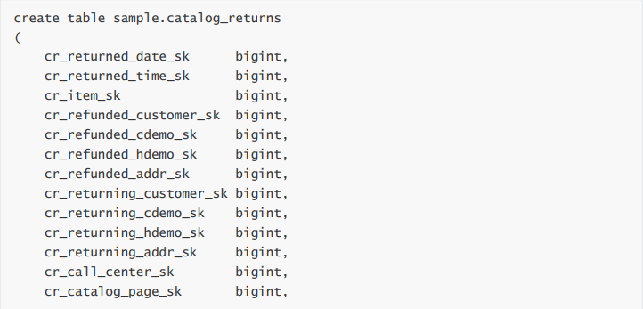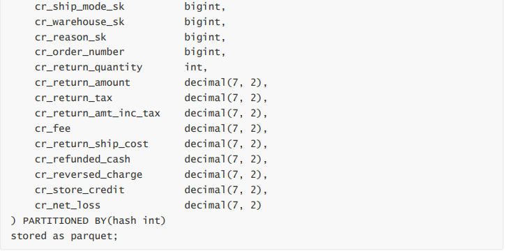 首先我们在 Hive 中创建一个 sample.catalog_returns 表,用于写入生成的 TPCDScatalog_returns 数据,并添加一个 hash 字段作为分区。